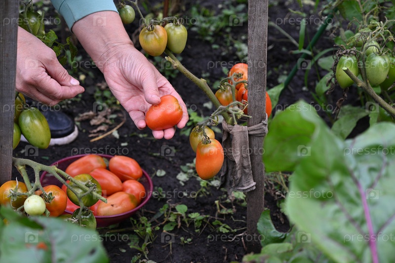 Сбор свежих помидоров в оживленном саду в течение летнего сезона с помощью руки, выбирающей спелые фрукты