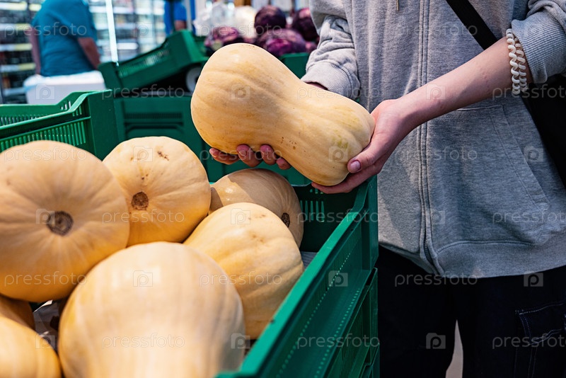 Выбор спелого сквоша в продуктовом магазине при покупке свежих продуктов в условиях городского рынка