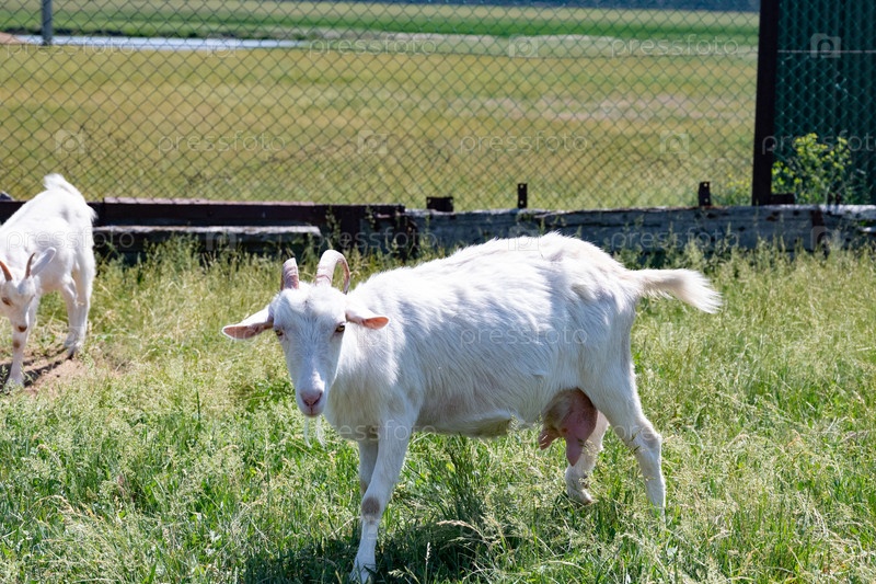 Белая коза движется по пышной зеленой траве на открытом пастбище, наслаждаясь теплым летним днем, в то время как другая коза видна на заднем плане