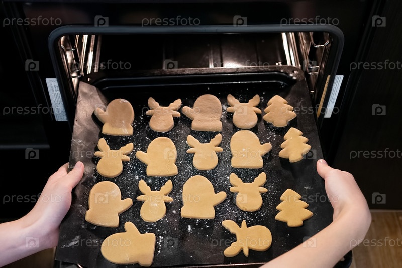 Сухие фигуры в форме праздника сидят на подносе для выпечки, когда его вытаскивают из духовки, готовые к превращению в вкусные праздничные угощения для торжеств
