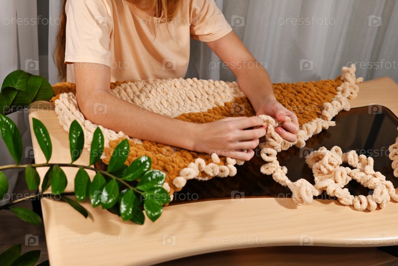 Творческий проект в уютной обстановке в помещении, демонстрирующий человека, работающего над текстильным произведением ручной работы с использованием современных технологий