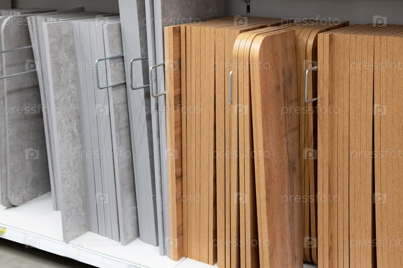 Полки, заполненные различными образцами ламината и деревянных панелей в нейтральных цветах, аккуратно расположены, демонстрируя варианты напольного покрытия или шкафа в магазине благоустройства дома