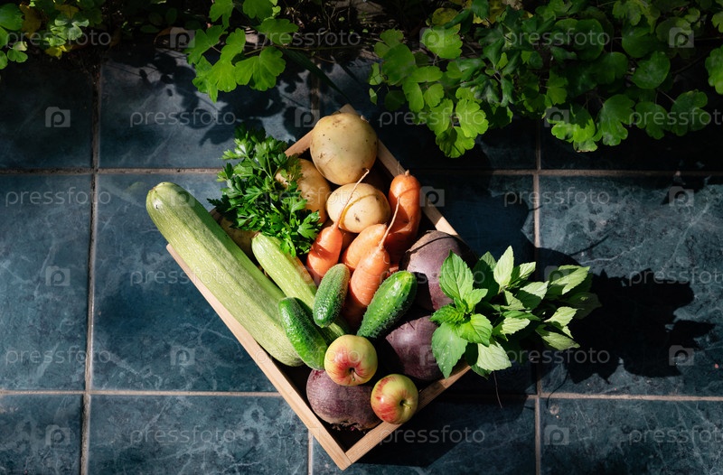 Свежесобранные овощи и фрукты в деревянной корзине, расположенной на черепичном полу в естественном свете