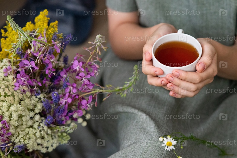 Расслабление с чашкой травяного чая, сидя на полу в окружении свежих цветов в уютной обстановке в помещении
