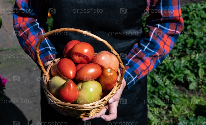 Сцепление свежесобранных помидоров в черной толстовке, наслаждаясь солнечным днем в саду