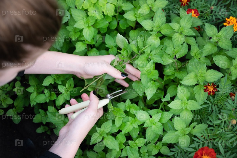 Выращивание лекарственных растений в саду, наполненном пышной зеленью и яркими цветами. Сбор мяты перечной
