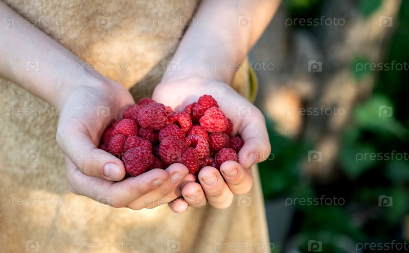 Свежесобранная малина держится в руках с естественным фоном в саду в течение лета