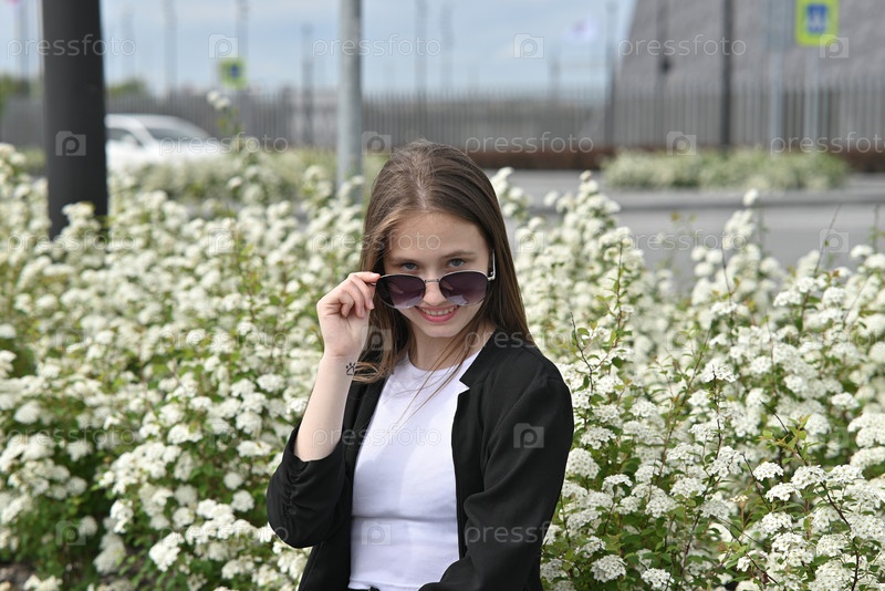 Женщина в солнцезащитных очках улыбается возле белых цветов в солнечный день на открытом воздухе