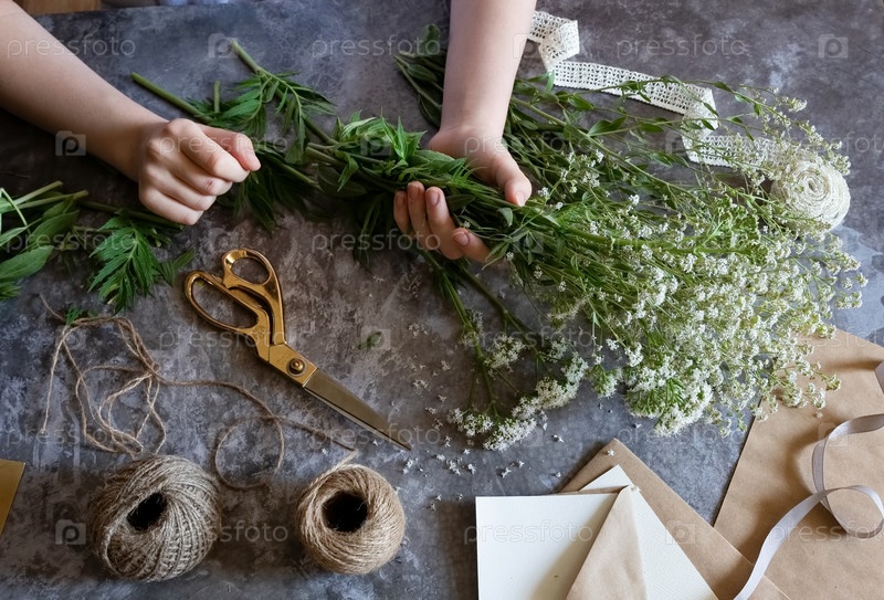 Флорист на работе: симпатичная женщина готовит на сером столе летний букет белой гипсофилы. Крафт-бумага, ножницы, приветственный конверт на столе. Вид сверху. Композиция плоская