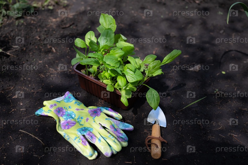 Горшок с молодыми растениями, готовыми к переносу в садовую почву вместе с небольшой лопатой для садовых задач
