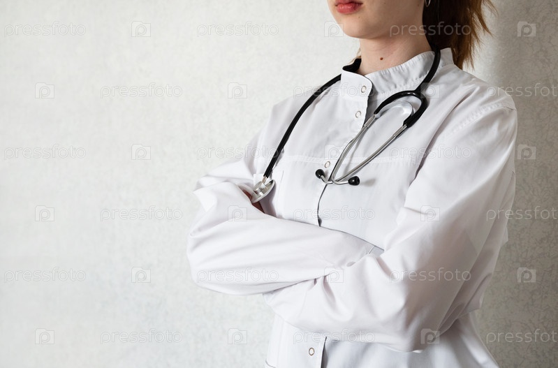 Молодой медицинский работник уверенно стоит, надев белый лабораторный халат со стетоскопом на шее. Мягкое освещение подчеркивает профессиональную атмосферу комнаты