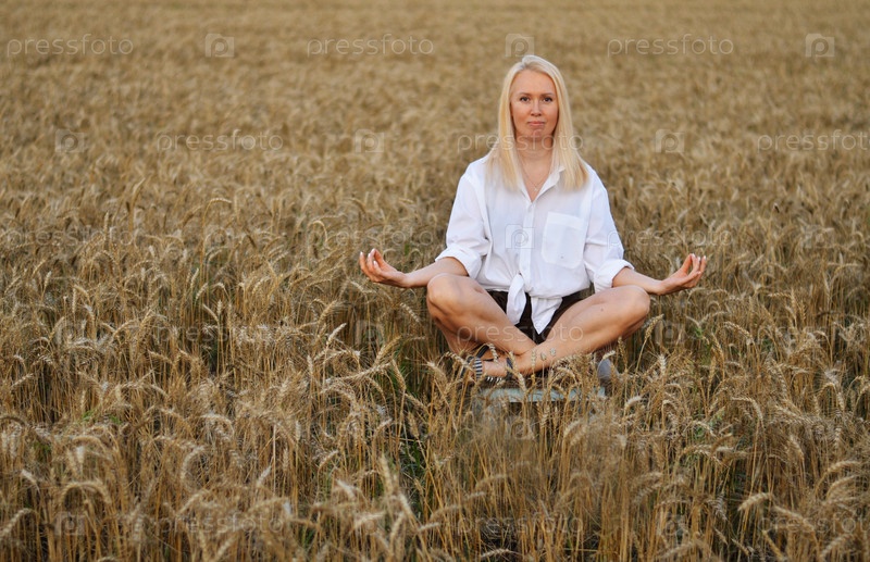 Женщина медитирует, сидя скрестив ноги на золотом пшеничном поле в часы заката, чтобы почувствовать мир и спокойствие