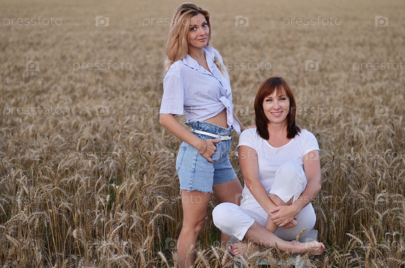 Две женщины, сидящие вместе на золотом пшеничном поле во время заката, разделяют момент дружбы и связи