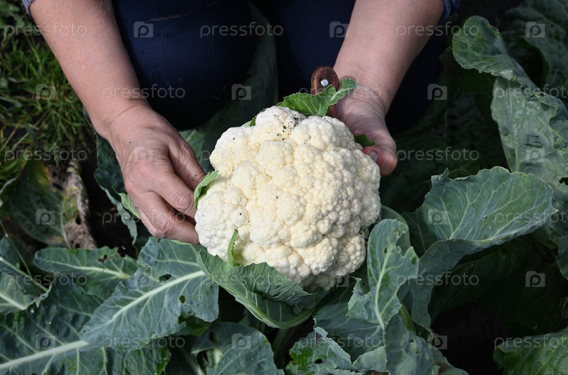 Сбор свежей цветной капусты в саду на заднем дворе в конце лета, подчеркивая радость домашнего садоводства и устойчивых методов питания