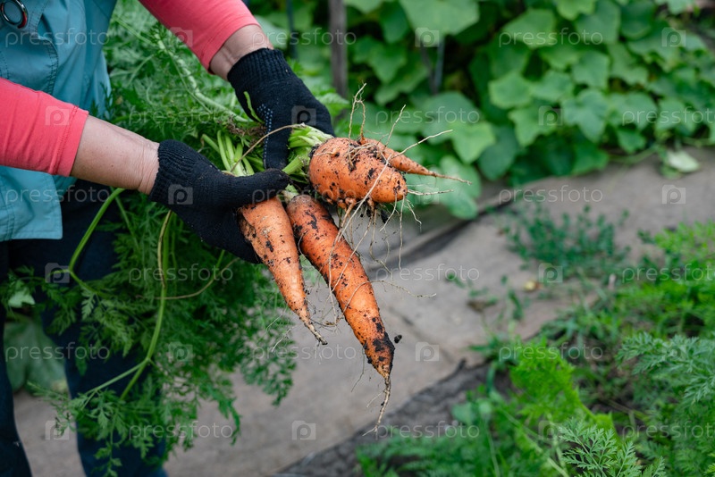 Сбор свежей моркови в домашнем саду, окруженном пышными зелеными растениями в солнечный день