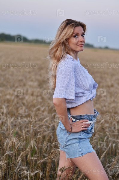 Женщина стоит на золотом поле пшеницы во время заката, демонстрируя природную красоту и спокойствие в сельской местности