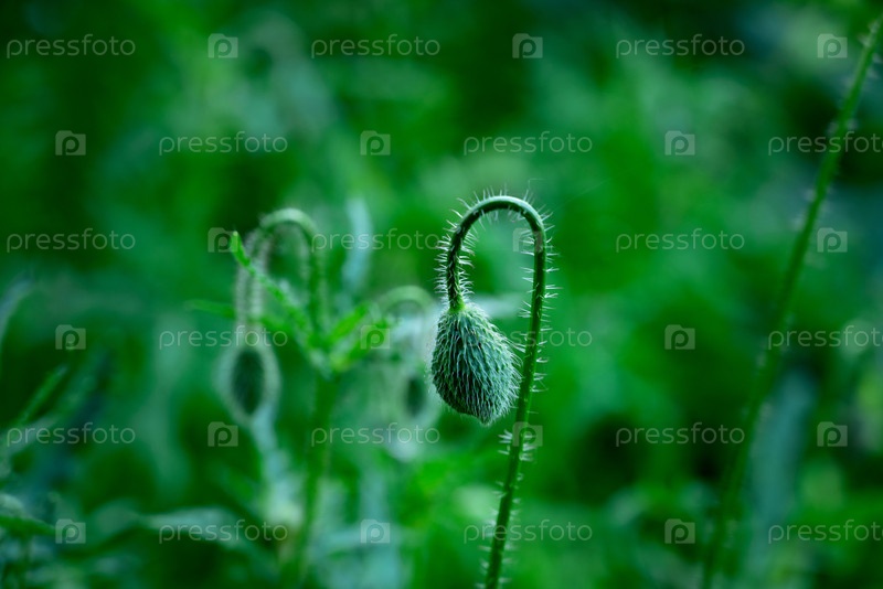 Нежный зеленый маковый бутон стоит высоко среди мягкой зеленой листвы, освещенной нежным утренним солнечным светом, что указывает на смену времен года и новую жизнь