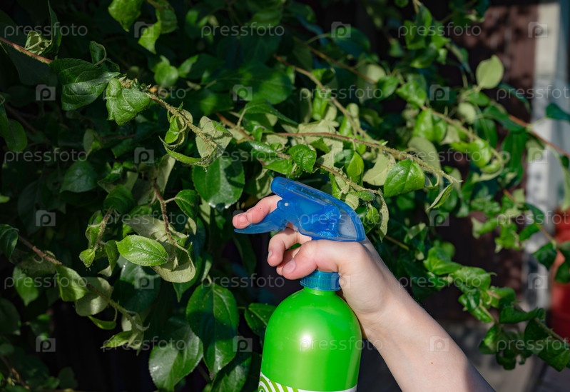 Садовник использует баллончик для ухода за зелеными листьями в саду на заднем дворе в дневное время