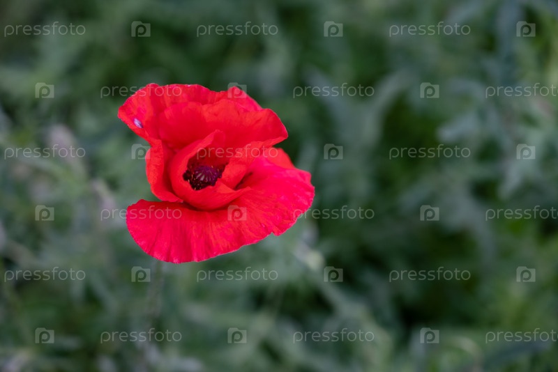 Поразительный красный цветок цветет среди зеленой листвы в саду в конце весны, создавая красочный контраст с окружающими растениями