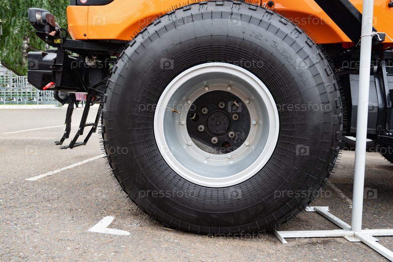 Замыкание колеса трактора с оранжевым ободком на травянистой земле