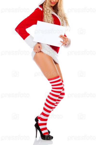 Молодая красивая женщина в рождественском платье с пустым белым баннером собирается показать свою красивую задницу на изолированном фоне