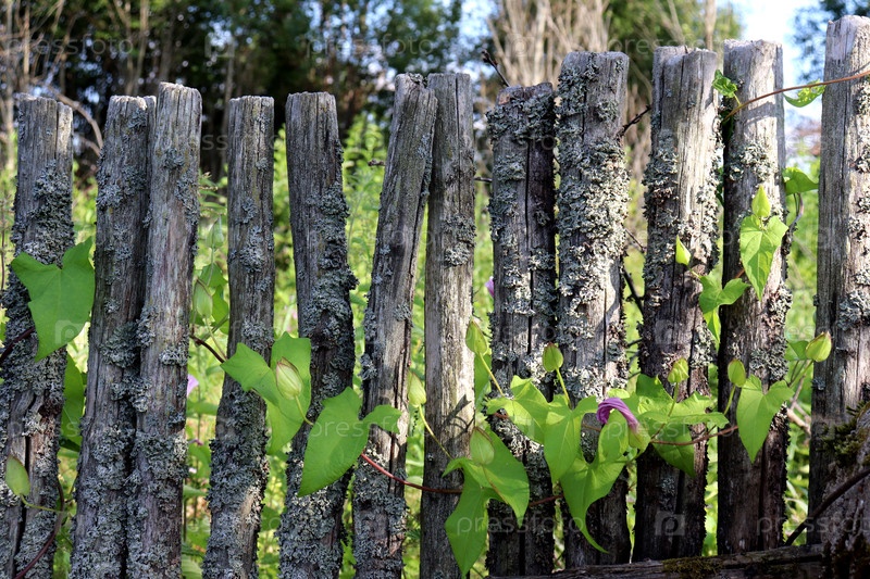 Старый забор из кольев со мхом и вьюнком солнечным летним вечером в полутени
