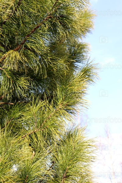 Кедровые хвойные зеленые ветви в солнечном свете на фоне голубого весеннего неба