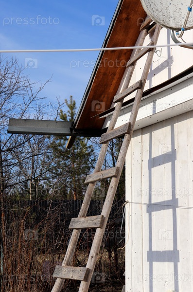 Деревянная самодельная лестница прислонена к стене и крыше сельского дома в саду в солнечный весенний день