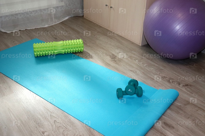 Спортивный инвентарь, коврик для йоги с загнутым краем, гантели, рол и фитбол у шкафа в комнате