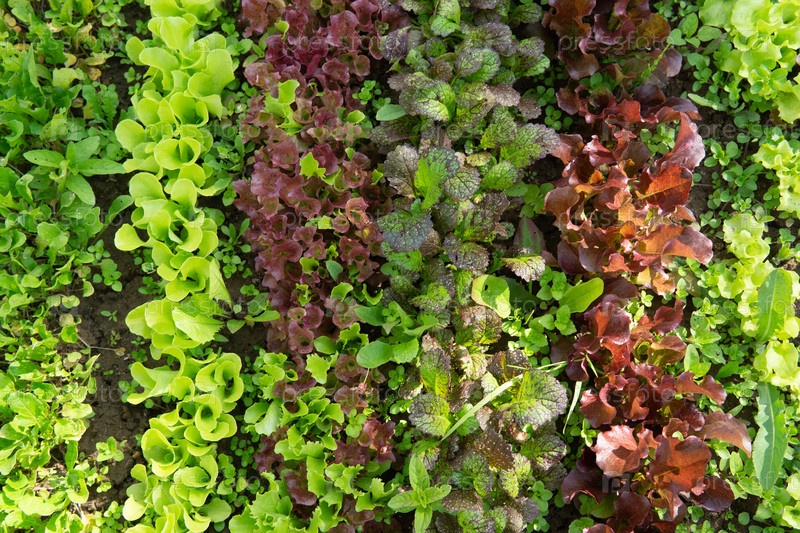 Ряды салата и горчицы разных цветов в садовой кровати