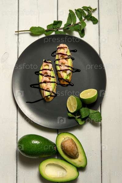 Брусчетта с креветками, авокадо и лаймом на белом деревянном фоне