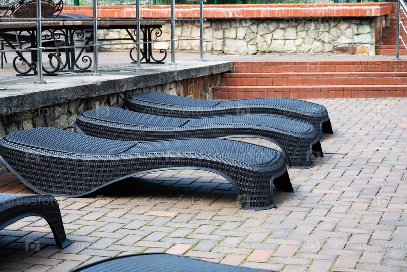Ряд черных шезлонгов рядом с пустым бассейном на кирпичном дворике. Наружная обстановка с фоном каменной стены. Концепция отдыха и релаксации