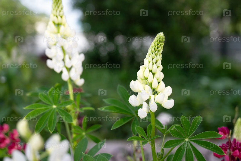 Цветы люпина цветут в ярком саду, демонстрируя белые и розовые сорта во время теплого дневного света в весенний сезон