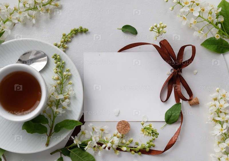 Плоская карта, окруженная нежными цветами и узорчатыми тенями на мягкой белой поверхности в естественном свете