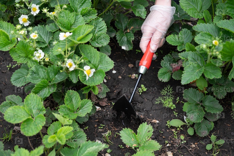 Садоводческие мероприятия в домашнем саду с клубничными растениями в весеннее время