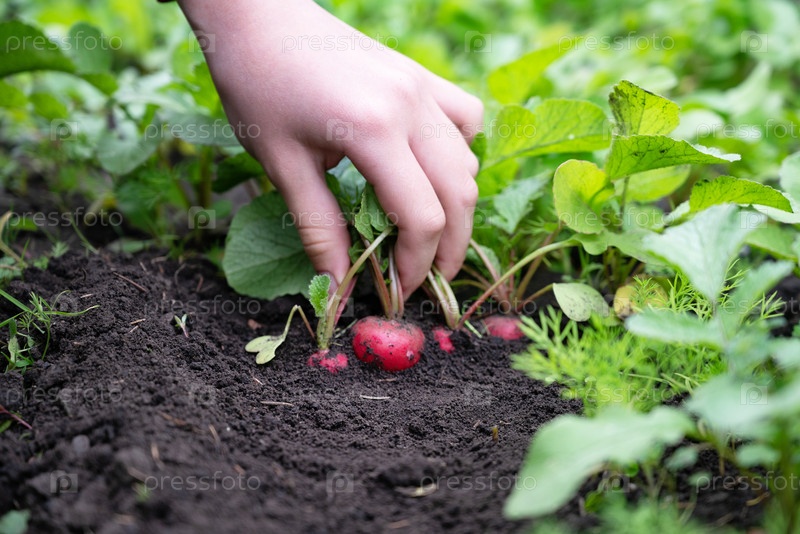 Руки держат свежесобранные редисы из сада в солнечный день