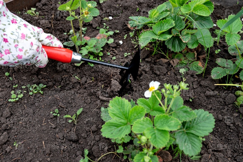 Рука с цветочной садовой перчаткой использует небольшой ручной инструмент для выращивания почвы вокруг ярких клубничных растений, демонстрируя продуктивный весенний сад