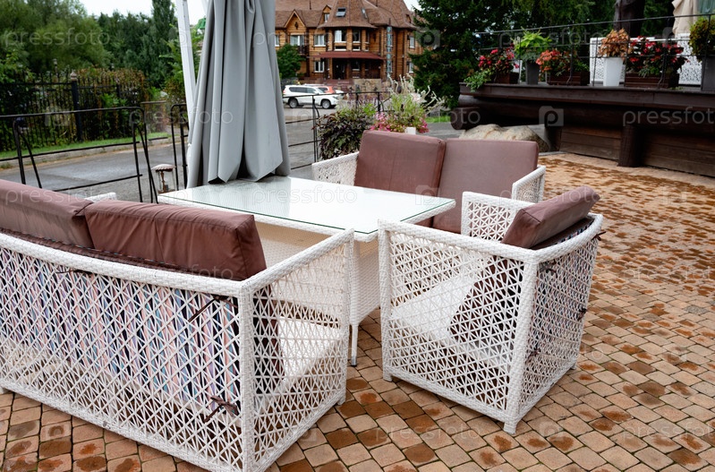 Наружная плетеная мебель с стеклянным столом на патио