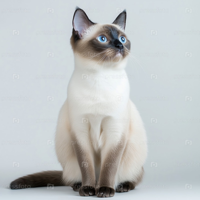 Сиамская кошка с голубыми глазами на сером фоне, вид сбоку
