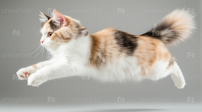 Трехцветный котенок прыгает, изолированный на сером фоне