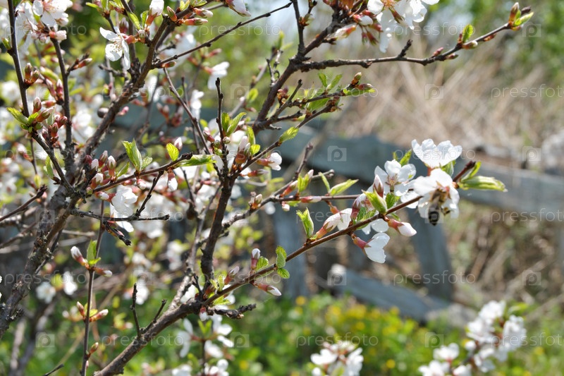 Вишня цветет в яркий солнечный день