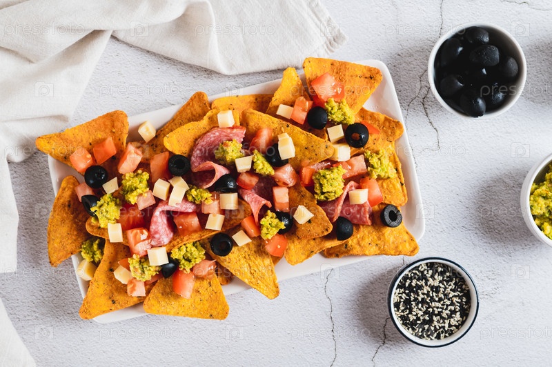 Мексиканские чипсы начос с оливками, помидорами, салями и сыром на вид сверху