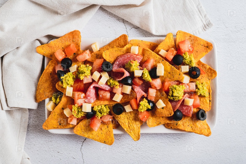 Закройте мексиканские чипсы начос с оливками, помидорами, салями и сыром на верхнем снимке тарелки