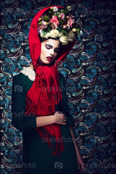Элегантность. Изящная леди в фиолетовом шарфе и венке из цветов