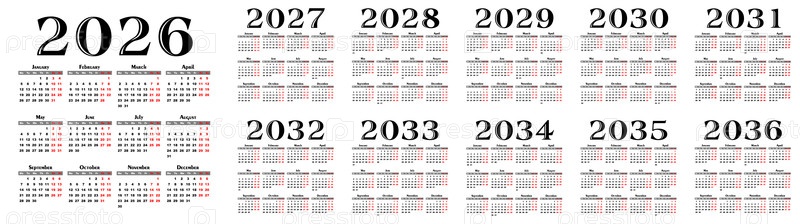 Набор шаблонов календаря на 2026-2036 годы