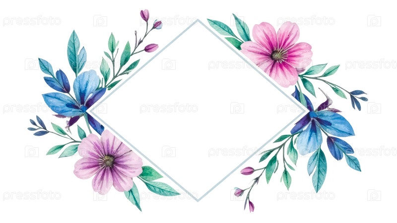 Мокап с акварельной иллюстрацией в форме ромба, украшенной розовыми и синими цветами, зелеными листьями на белом изолированном фоне с копировальным пространством