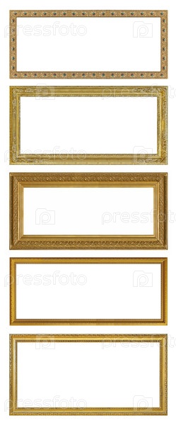 Набор золотых рамок для картин, зеркал или фотографий, изолированных на белом фоне