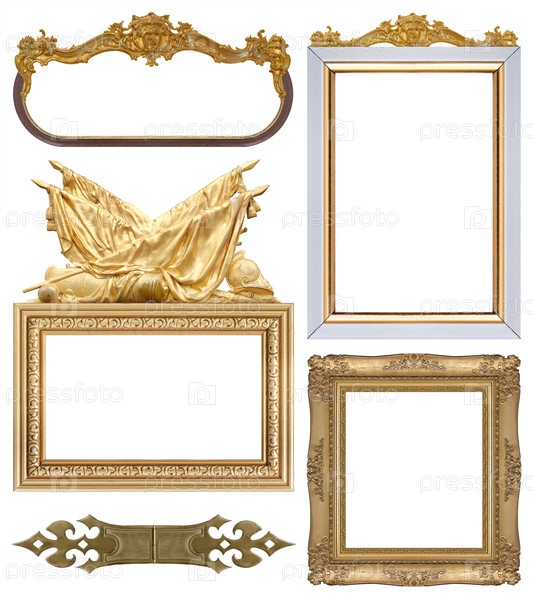 Набор золотых рамок для картин, зеркал или фотографий, изолированных на белом фоне
