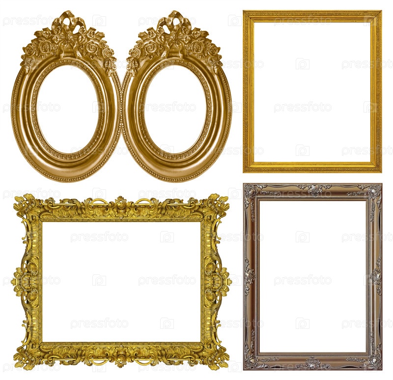 Набор золотых рамок для картин, зеркал или фотографий, изолированных на белом фоне