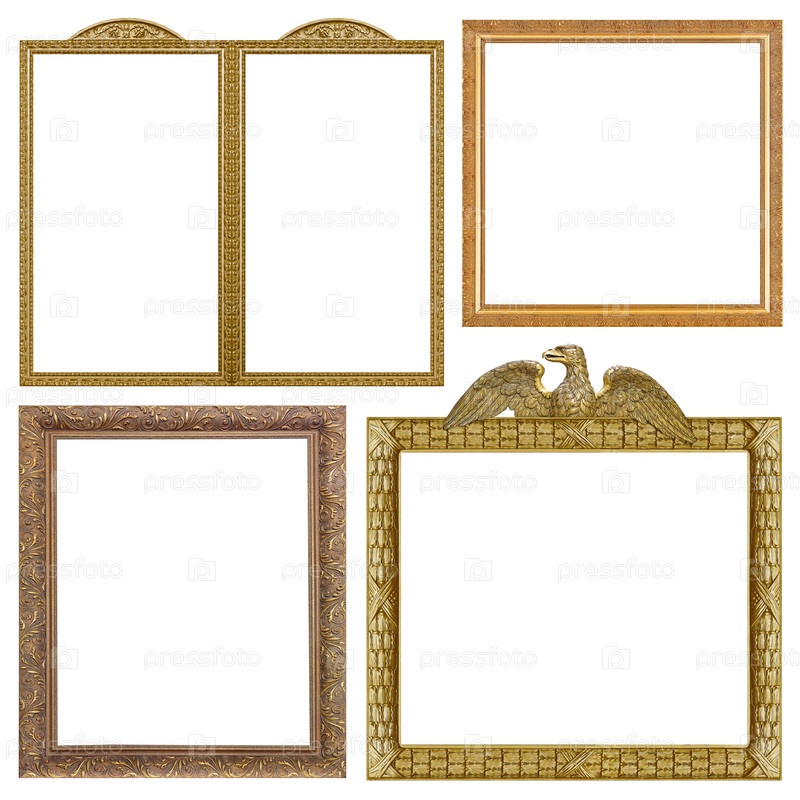Набор золотых рамок для картин, зеркал или фотографий, изолированных на белом фоне
